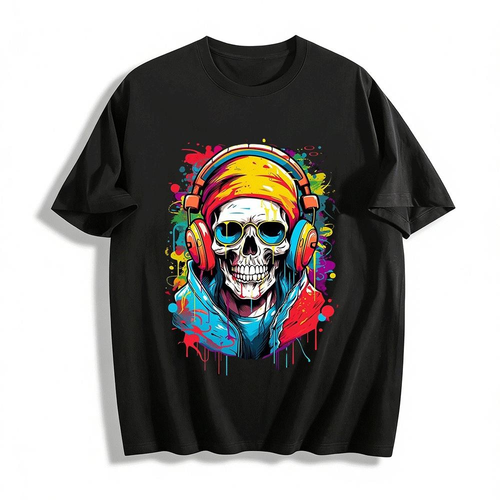 Cool Skull With Headphones Graffiti Style Graphic Casual Tee Pure cotton T-shirt