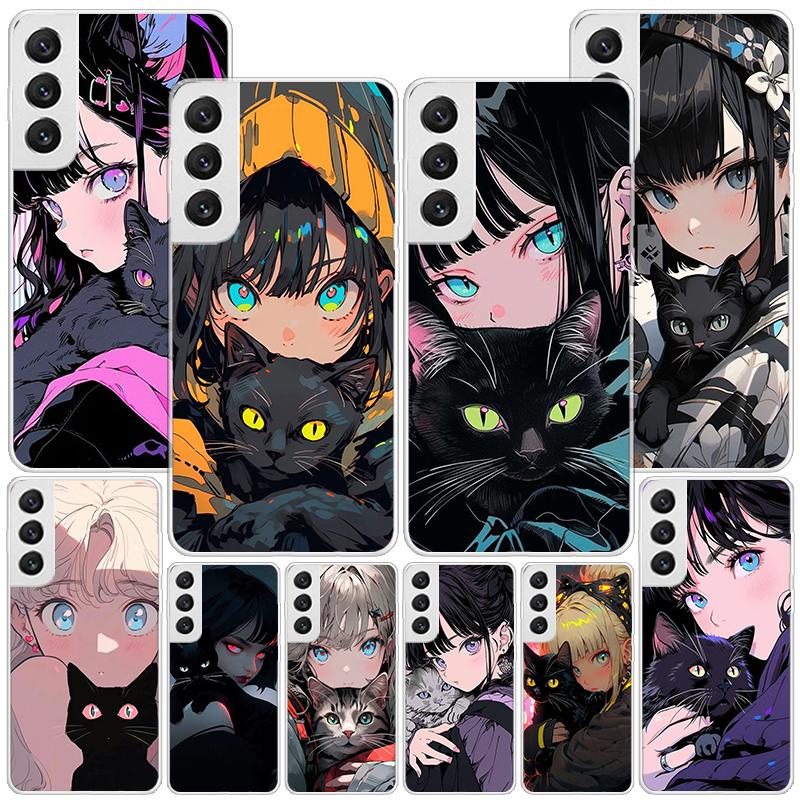 Anime Girls Cute Black Cat Phone Case For Samsung Galaxy S24 S25 Edge S26 Ultra S23 S22 S21 Plus S20 FE + Personalized Print Cov