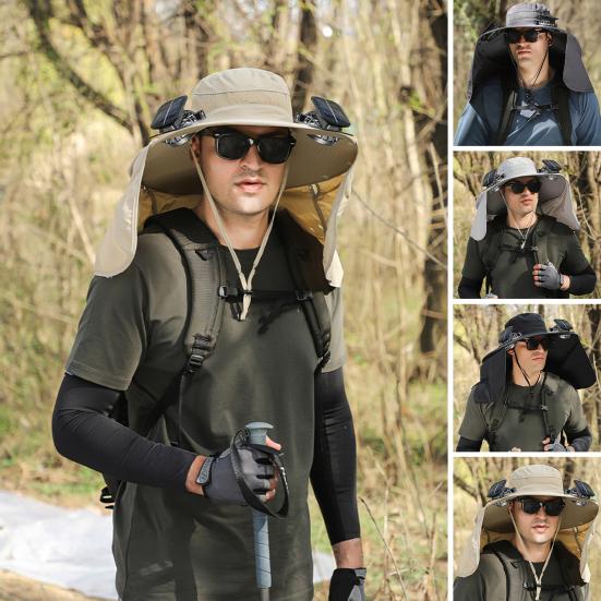 Bucket Hat Lightweight Breathable Water-Repellent Fabric Hiking Hat Adjustable Chin Cord Foldable Neck Guard Sun Hat with 2 Fans