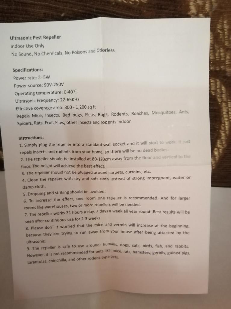 I received it, everything came well packaged. I plugged it in, it lights up. I will write what the result will be later. It works perfectly. The mice are gone, there is not even a smell in the pantry. Thank you very much.