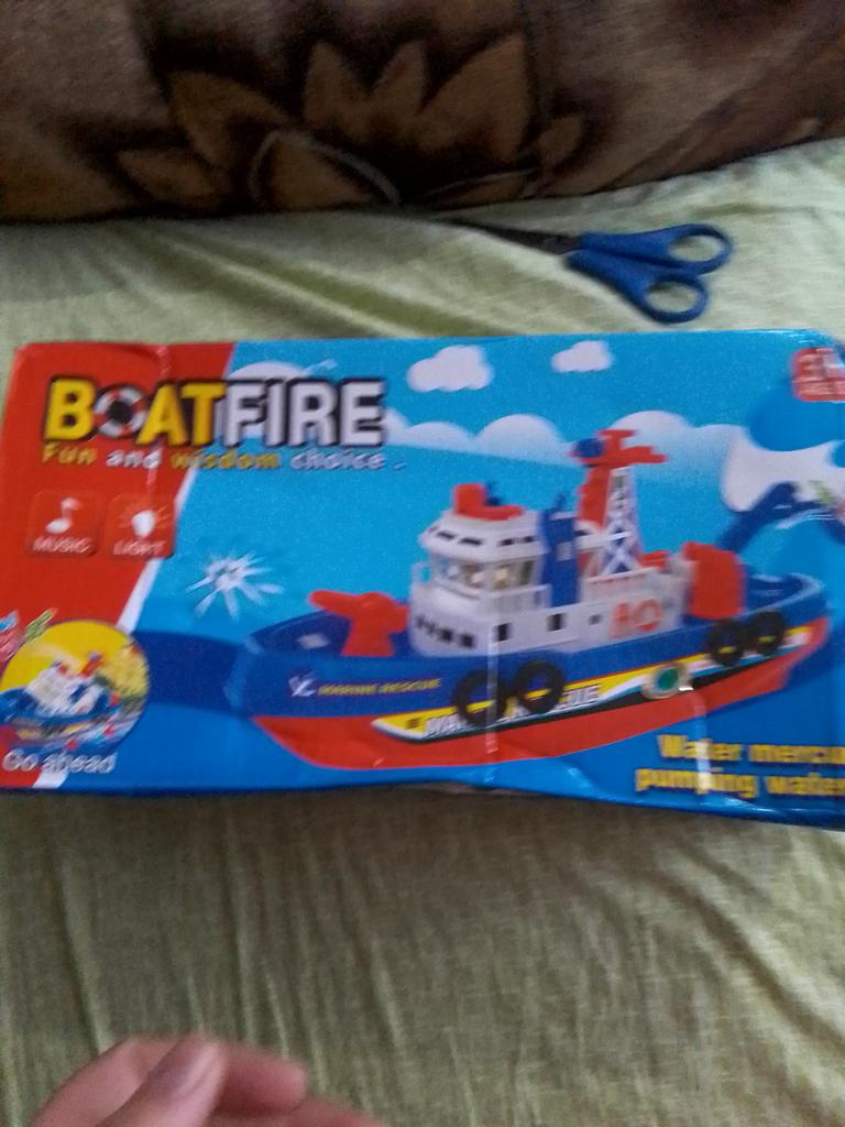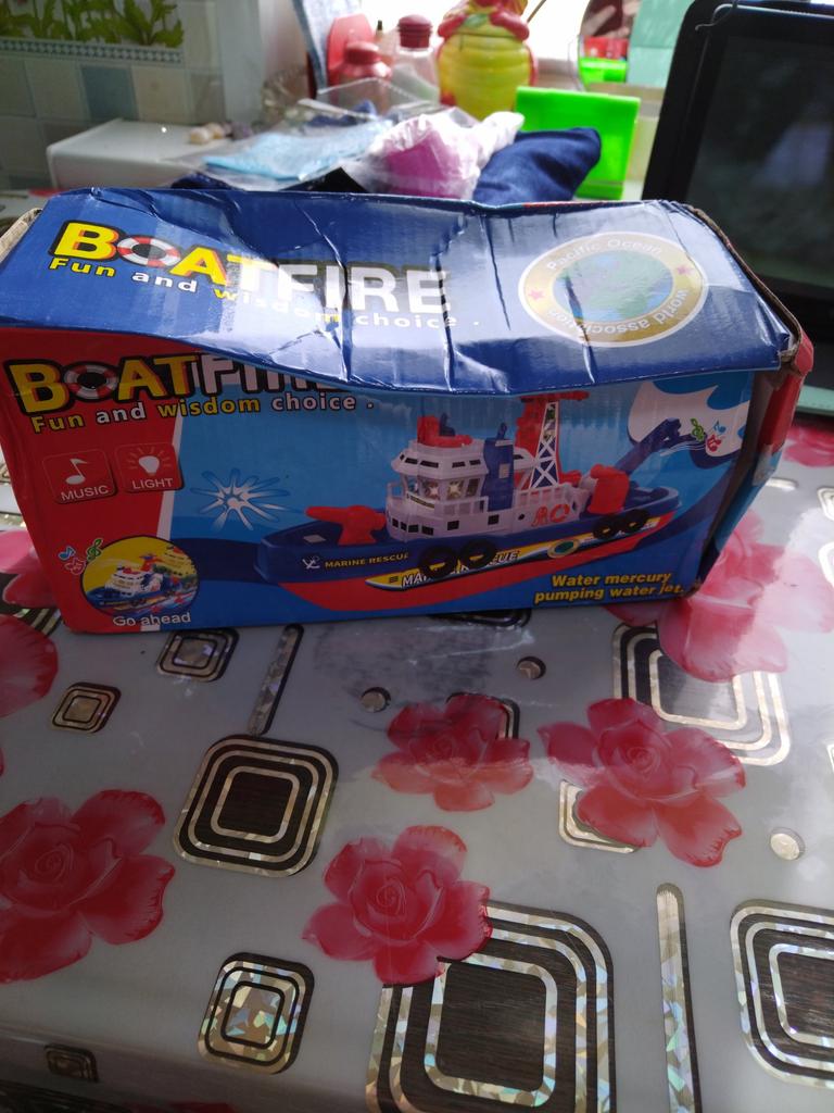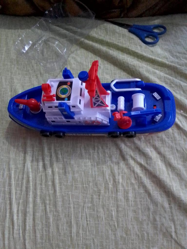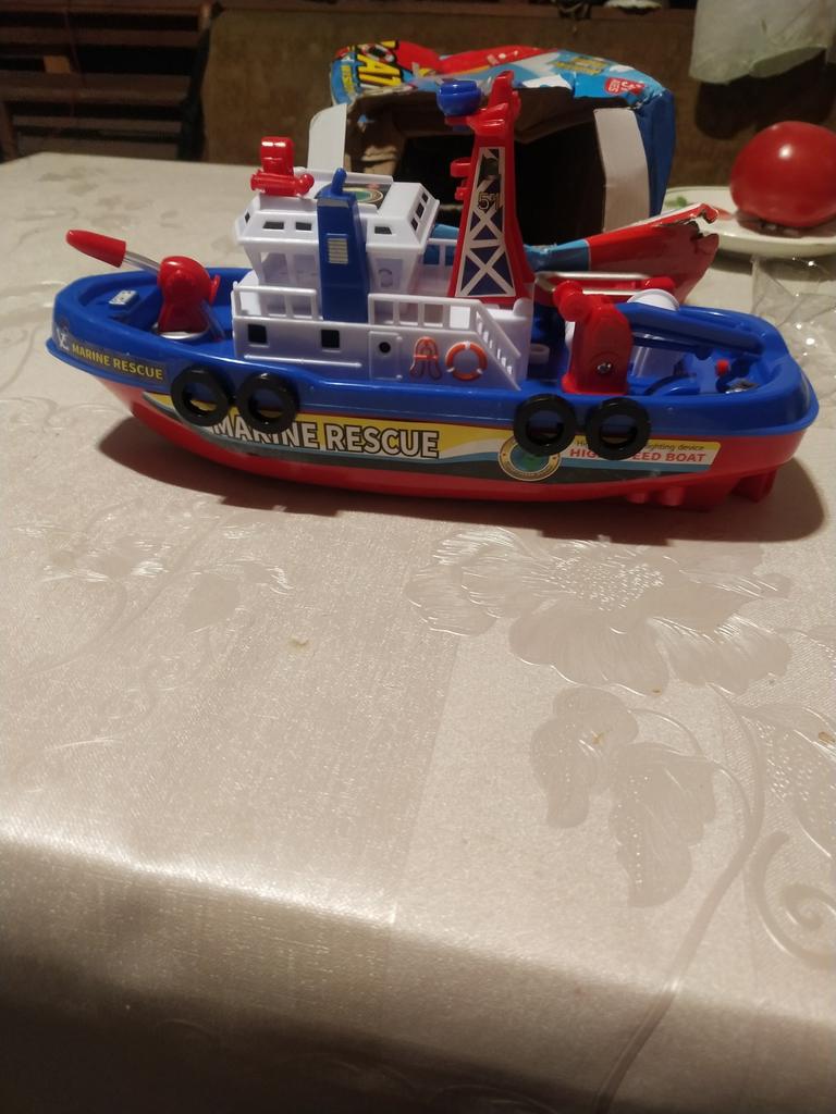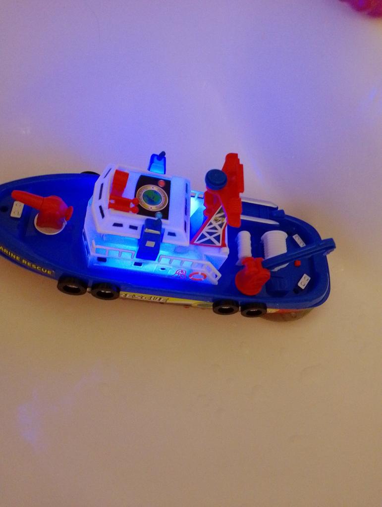 Cool boat. Almost indestructible. It moves by itself, flashing, with sound, and water pours out from the front outlet. It runs on batteries, but they last for a long time, which is very interesting.