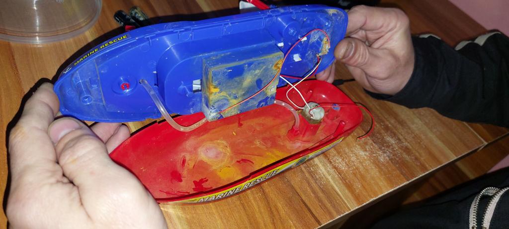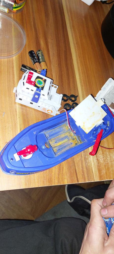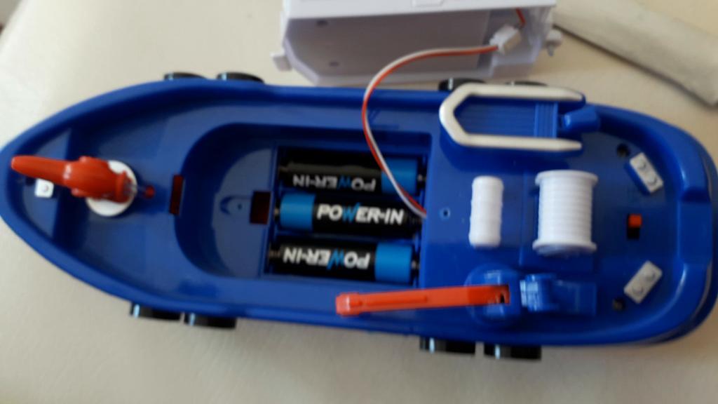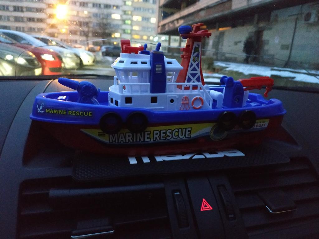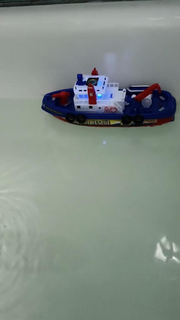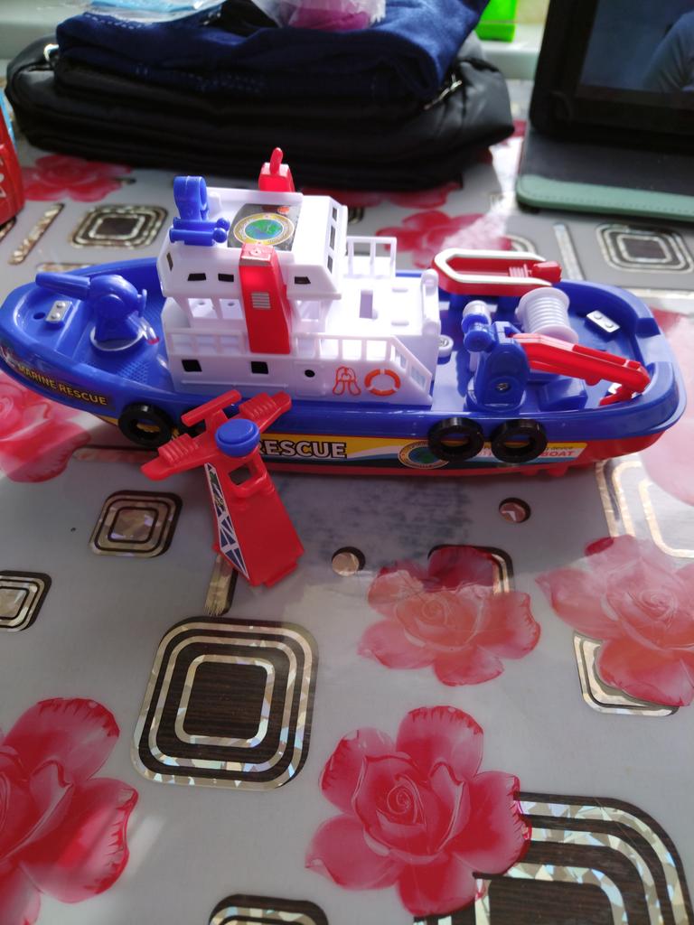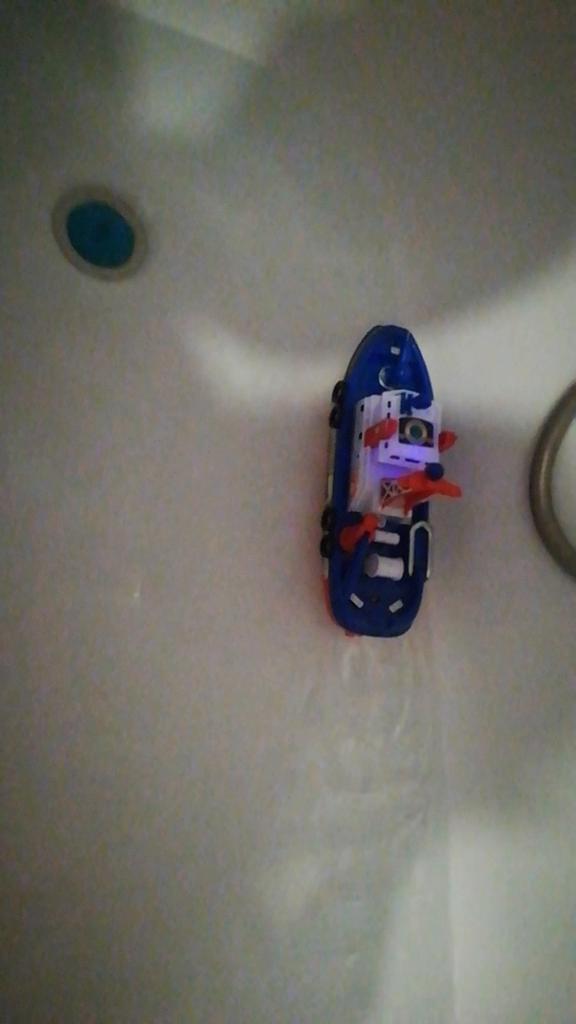 Cool boat. Almost indestructible. It moves by itself, flashing, with sound, and water pours out from the front outlet. It runs on batteries, but they last for a long time, which is very interesting.