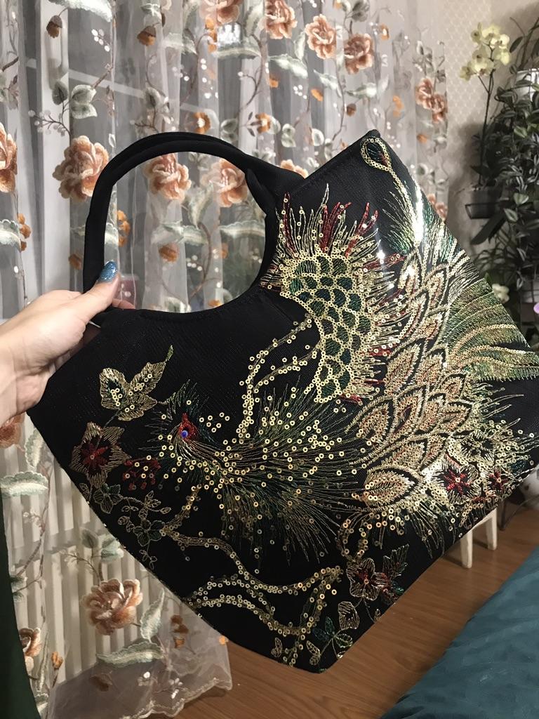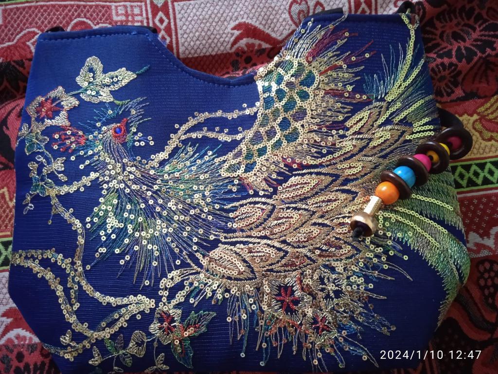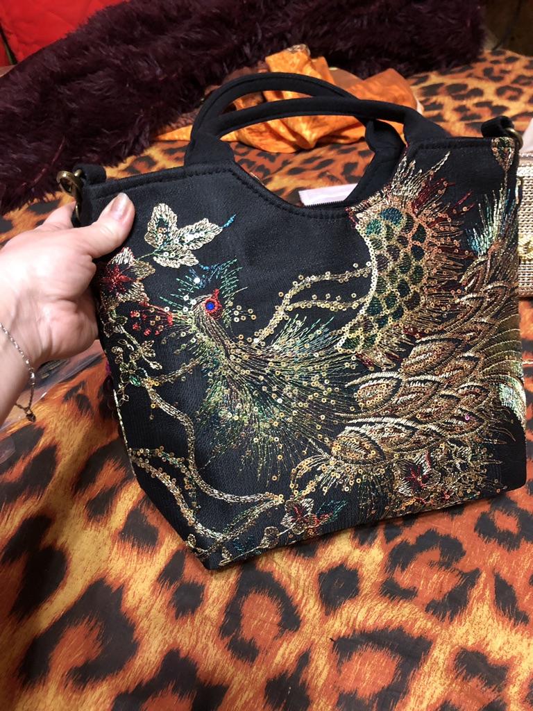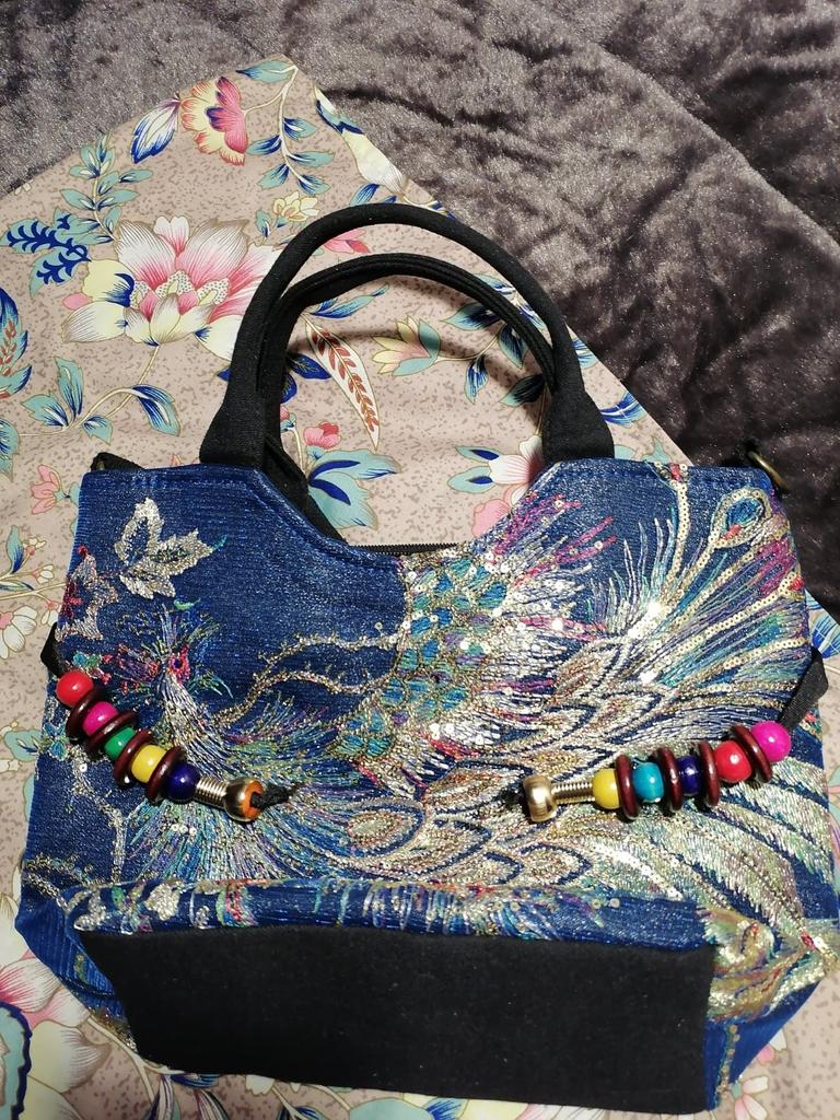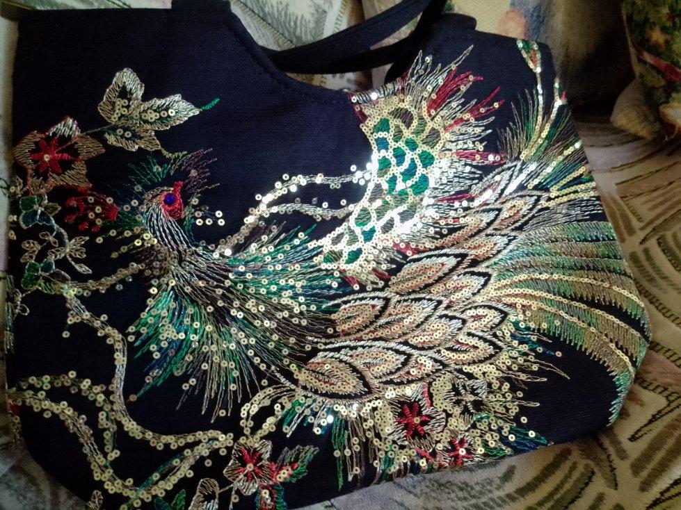 The bag is beautiful, embroidered, not very big, medium. It would be good to create an East Asian look around it.
