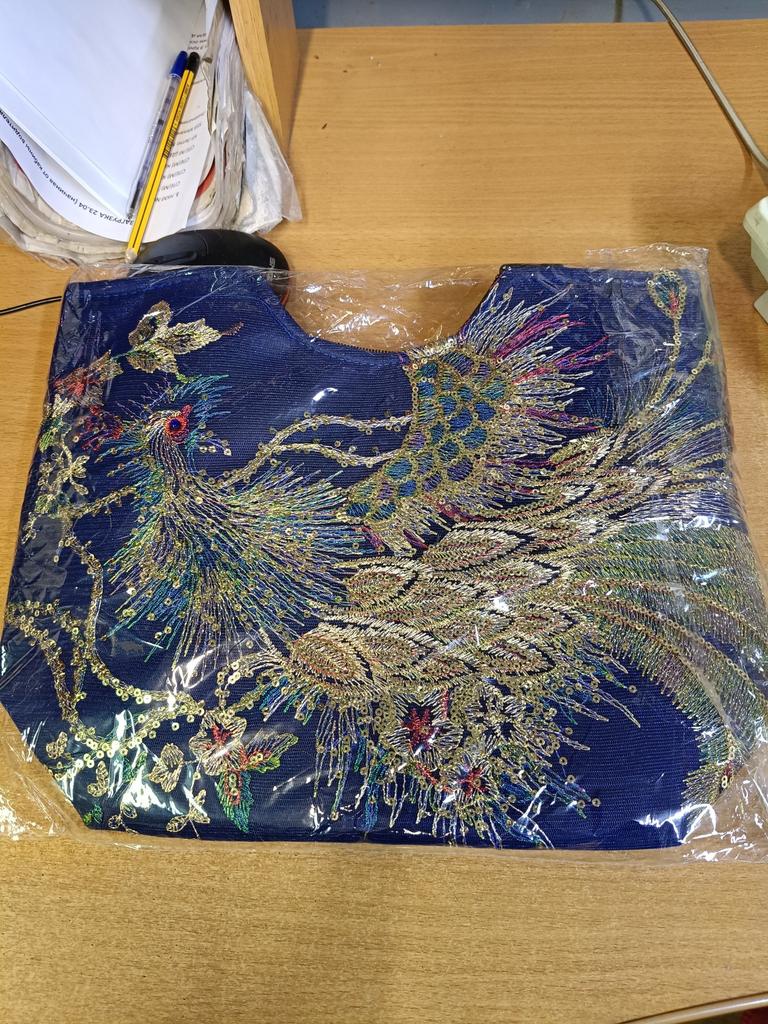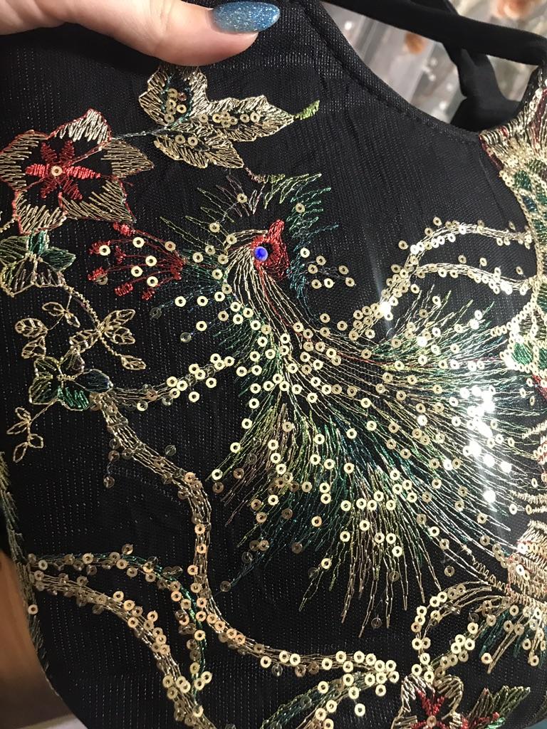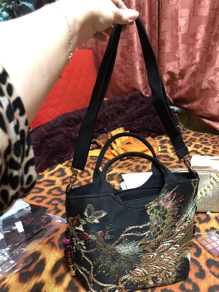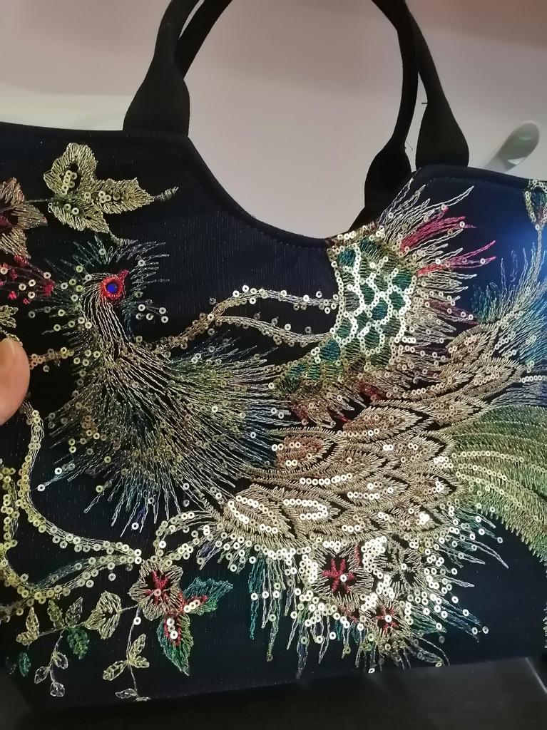 The bag is beautiful, embroidered, not very big, medium. It would be good to create an East Asian look around it.