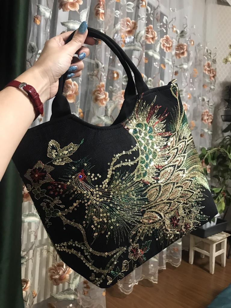 Shiny Sequins Peacock Embroidered Women Canvas Totes Bag, Summer Shopping Shoulder Bag Vintage Beaded String Handbag