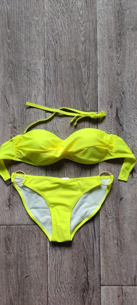 Women's bright yellow summer separate swimsuit. I ordered based on the reviews, it turned out to be too big for me. If the girls took the measurements correctly, then the others chose the sizes correctly. The panties are again crookedly sewn from the back 😬😬😬😬 That one-handed sews underwear 😔 I do not recommend the seller