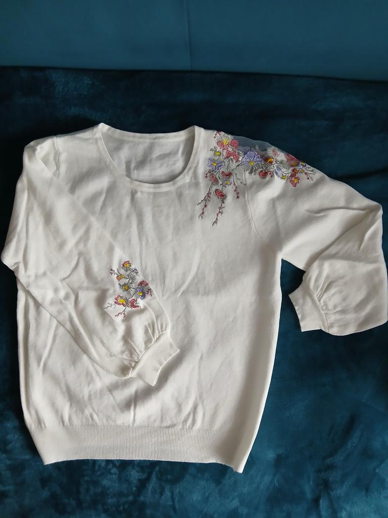 Thank you very much. The blouse is thin, soft, and fits size 44 just right. The embroidery is neat, no threads stick out.