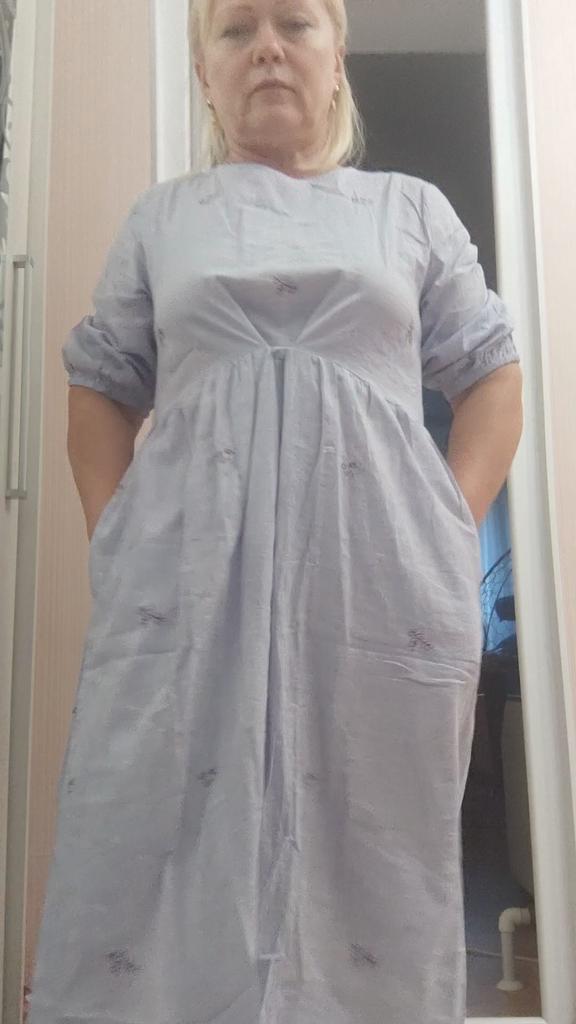 Dress thin cotton, color gray-blue, embroidery real, very delicate, light. For my parameters 100-80-104 I took L. Just right. A very pleasant bonus in the form of shaping shorts.