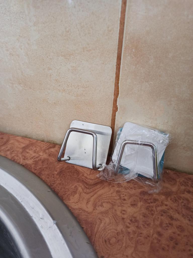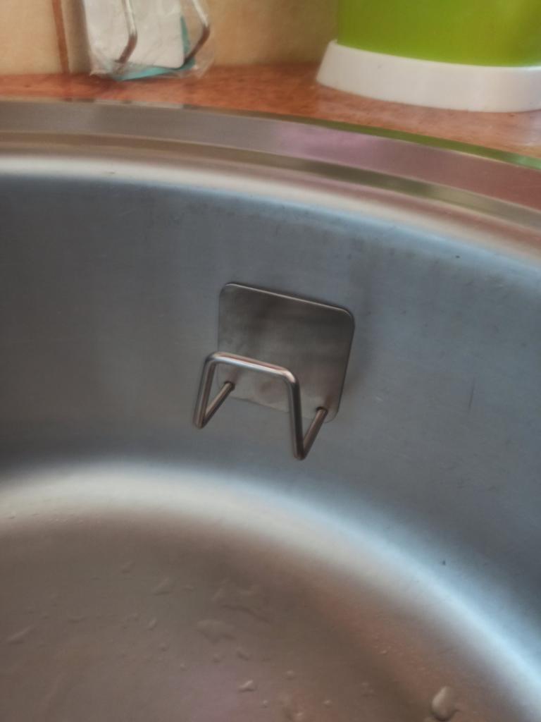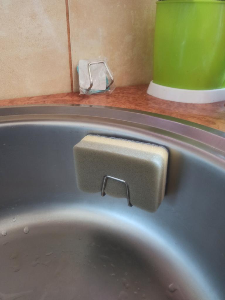 Sponge holder for sink. Comes 2 pcs. Holder material: stainless steel, not afraid of moisture. Dimensions: 4.9*4.9cm. The holder is easy to install, does not require drilling, but is simply attached with strong double-sided tape (included), and holds well in the sink. The self-adhesive holder can be used not only for the sink, but also for other kitchen utensils (boards, washcloths, etc.). I ordered it specifically for the sink. I've already attached it, it holds tightly, now the dishwashing sponge is always in its place.