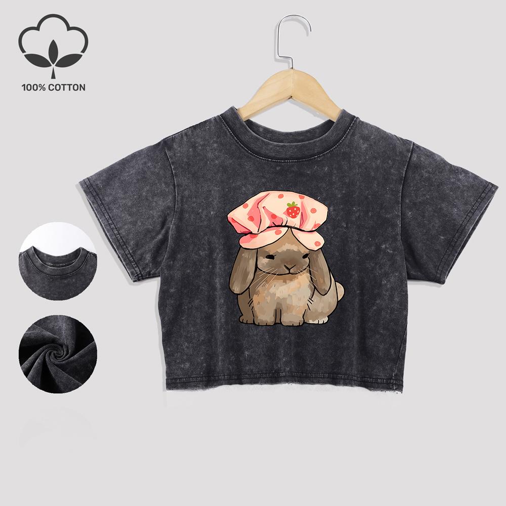 Cute Lop Eared Rabbit Printed Cotton Washed T-Shirt All-Math Summer Lace Hem Crop Tees Regular Fit O-Neck Tops Casual Clothes