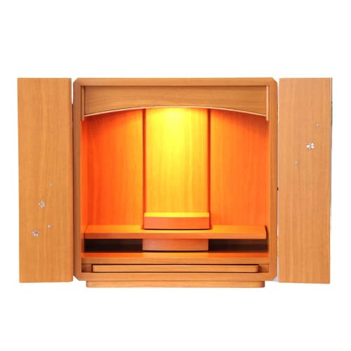 Mini Buddhist Altar "Spica" with Cherry Blossom Mother-of-Pearl Inlay, Furniture-Style Buddhist Altar with Light, Modern Buddhist Altar, Natural Style