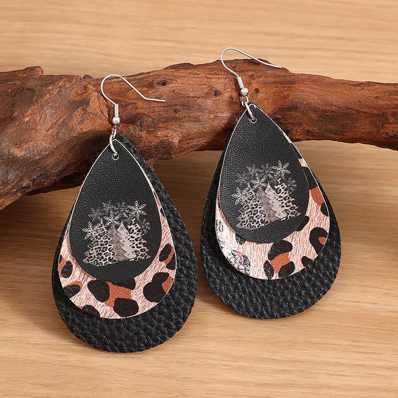 European & American Christmas Tree Teardrop Sequin Earrings, Leopard Print PU Leather.