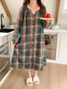 This comfortable and stylish set is perfect for autumn lounging. Made from a soft cotton blend, it features a charming green plaid pattern that embodies the cozy spirit of the season. The set includes a long sleeve dress and matching pajama bottoms, offering a loose-fitting design for ultimate comfort. Crafted with attention to detail, it's an ideal choice for relaxed home wear as the weather cools.