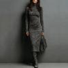 Women's Pleated Velvet Super Long Dress Long Sleeve High Neck Tight Long Dress Fashion Solid Color Dress