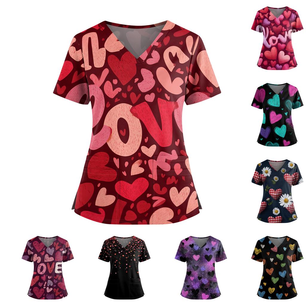 Women's Valentine's Day Printed V-Neck Double Pocket Short Sleeves Hem Slit Uniform Caregiver Top
