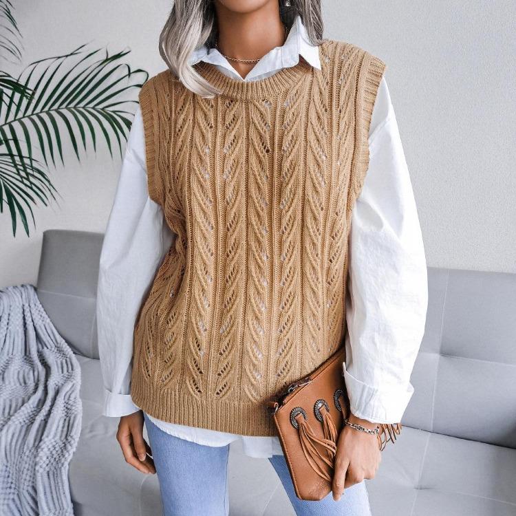 Fall Winter Women Sleeveless Crew Neck Solid Color Knit Sweater Tank Top with Cutout Leaf Design Sizes S To L