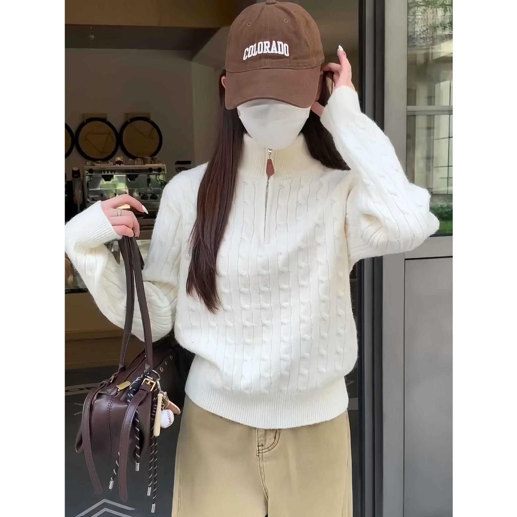 Autumn and Winter New Soft Waxy Gentle Half Zipper Stand-up Collar Twist Knitted Sweater Loose Sweater Women's Bottoming Shirt