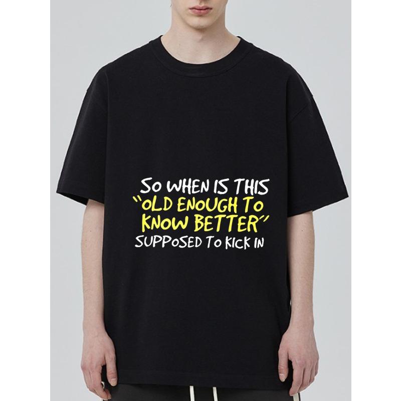 Black T-Shirt with So When Is This Old Enough To Know Better Supposed To Kick In Print for Casual Wear