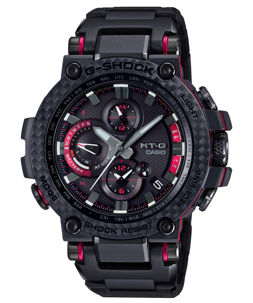 The MTG-B1000, featuring a shock-resistant metal and resin body, smartphone link functionality, and radio-controlled solar-powered functionality, is now available in a carbon fiber version. This model features a lightweight yet highly rigid carbon fiber bezel. The carbon fiber bezel's laminated sections feature accent colors, and the edges of the metal components that make up the exterior are mirror-polished and hairline-finished, achieving a rugged yet beautiful design. Highly transparent sapphire crystal and the indices and subdials crafted with the fine processing techniques of the Casio Yamagata Factory further enhance the quality. The bands are made with materials that are comfortable to wear*1, and the mid-size case and watch are designed for comfort. Functionally, the watch features the "Connected Engine" technology, which supports time correction via Bluetooth® connection. It connects to your smartphone via Bluetooth® communication and the dedicated app "G-SHOCK Connected*2" to obtain time information from an online time server. Multiband 6, which supports time calibration signals from six stations around the world, automatically adjusts the time in supported areas even without a smartphone connection. Accurate timekeeping is possible anywhere in the world. Introducing the latest evolution of the MT-G watch, featuring carbon-reinforced resin. This is the MTG-B1000XBD-1AJF.