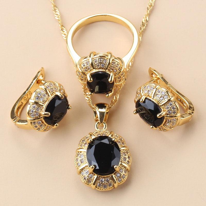 New Fashion Occident Style Black Zircon Luxurious Gold Plated Necklace Jewelry Sets For Women Clip Earrings And Ring