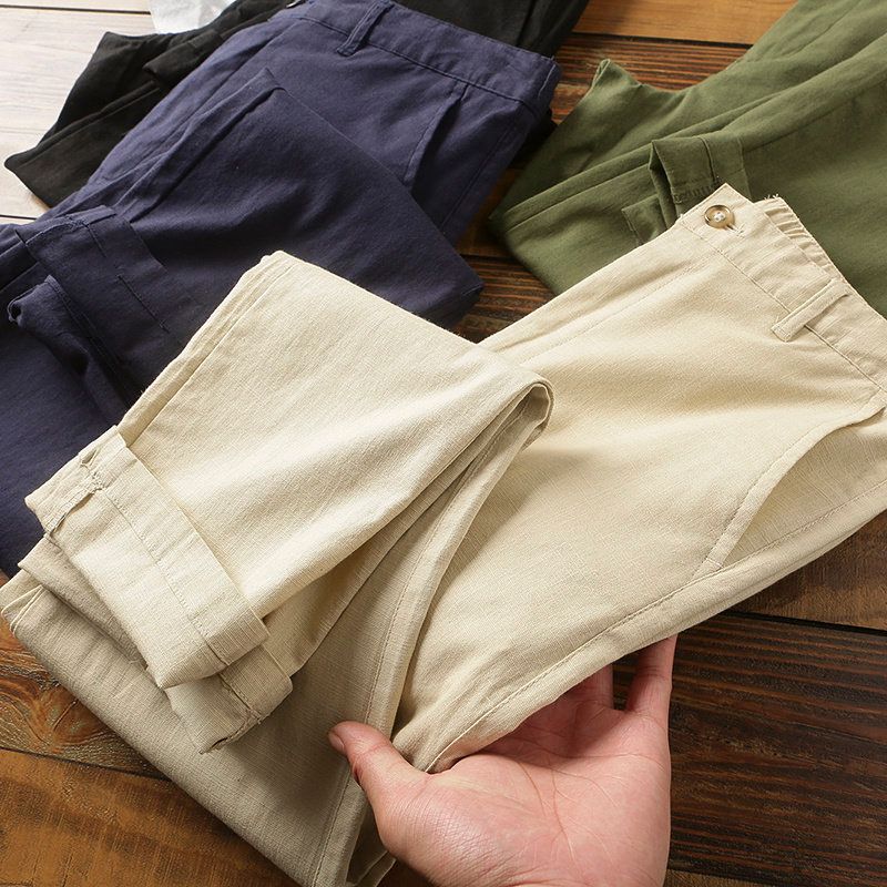 Breathable Linen! Export Men's Factory Balance Cargo with Logo Cut Off Men Pure Color Pencil Pants Cotton and Linen Casual Pants Cropped Pants
