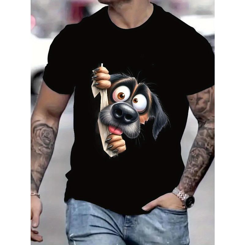 European Sizes Summer New Arrival T-shirt, Cartoon Dog Pattern, Cute and Playful,Comfortable and Breathable Men'S Black Short-Sleeve T-Shirt