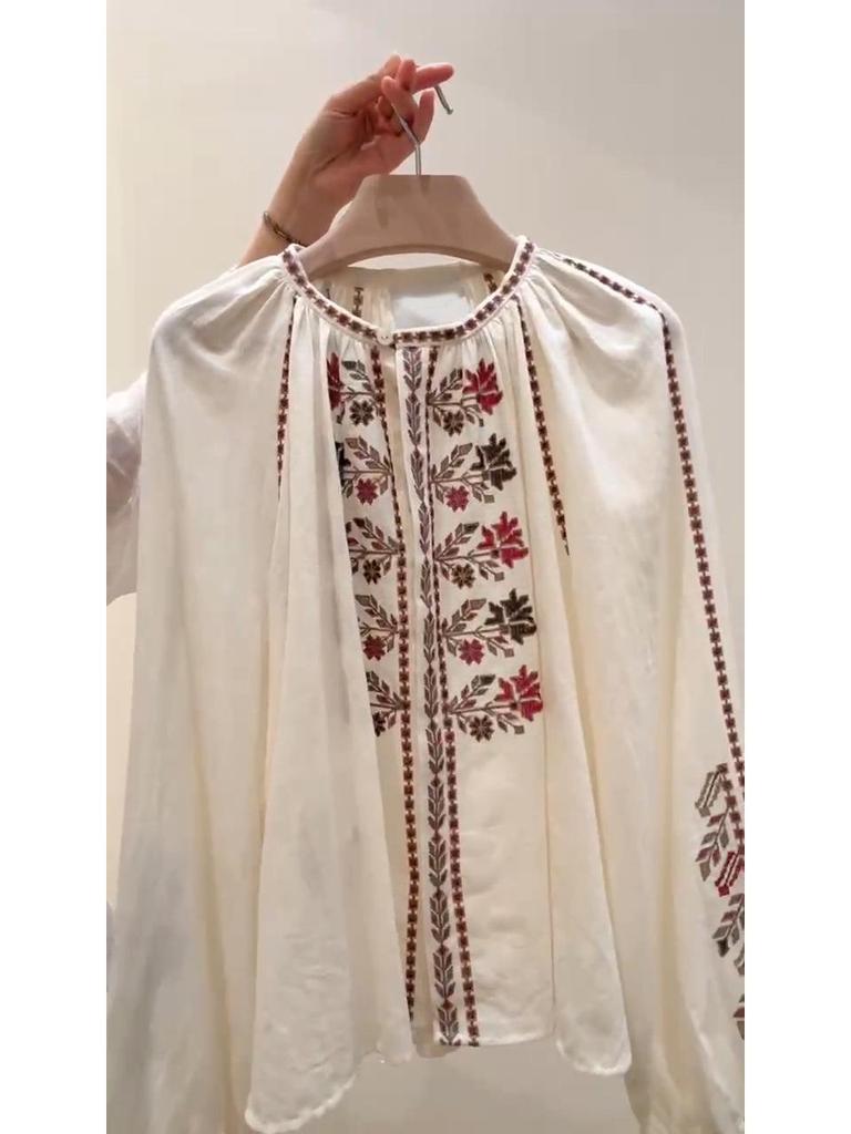2026 Early Spring Women's French Ethnic Embroidered Pure Cotton Shirt with Long Lantern Sleeves