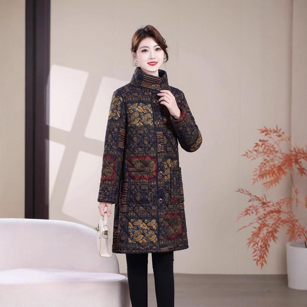 Floral Mid-Length Winter Cotton Jacket for Middle-Aged and Elderly Women - Warm and Stylish Outerwear.