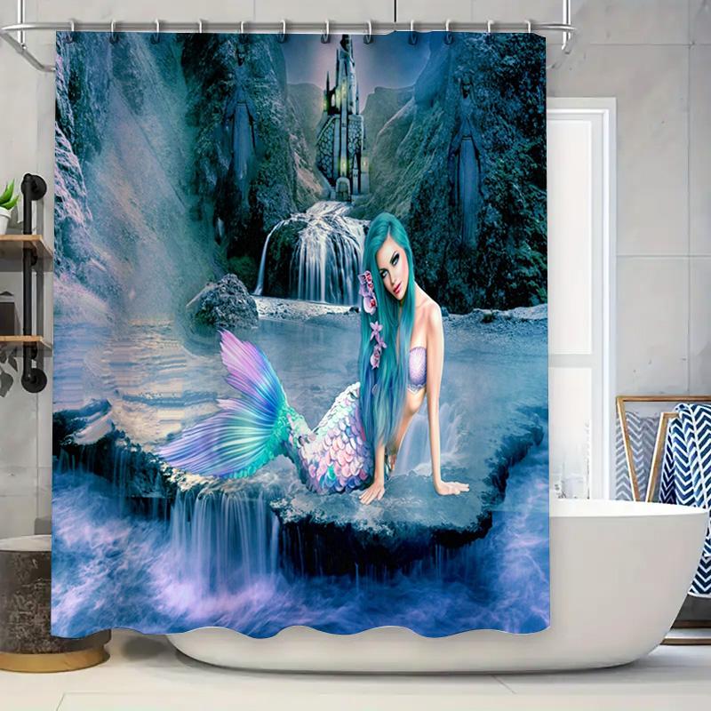 Mermaid Shower Curtain Fairy Tale Castle Fantasy Design Waterproof Fabric Custom Printed for Bathroom Decor Dark Blue Pink Green