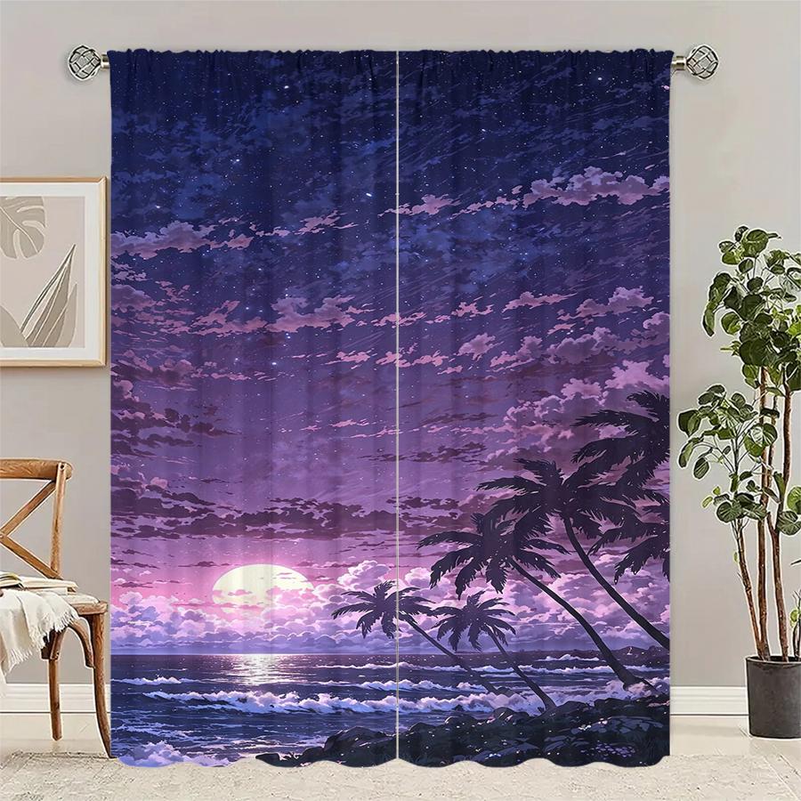 Beach Print Curtains Under Moonlight Pole Bag Christmas Decorations Daily Home Room Curtain Made Of Polyester Washable