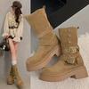 Women Western Cowgirl Boots Fashion Belt Buckle Shoes Autumn Winter Thick Heel Women's Mid Calf Booties Women Shoes