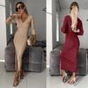 Women's Fashion Casual Slimming Solid Color Pleated V-neck Pleated Tie Waist Waist Strip Solid Color Dress