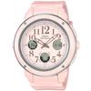 Introducing the CASIO Baby-G model BGA-150EF-4BJF, which features a vibrant pink color that adds a feminine touch. This watch is based on the basic model BGA-150, providing a wide face and a simple design. The use of pink gold Arabic numerals as indices creates a stylish harmony, and the digital LCD screen shows useful information such as the date, world time, and stopwatch functions. Moreover, it comes with an LED light feature that allows easy time-checking in dark environments.