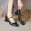 Thick Heel Mary Jane Single Shoes Women's New Spring French Mid Heel Evening Black Square Head Small Leather Shoes