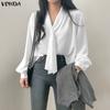 VONDA Women Autumn Lapel Solid Color Striped Long Sleeve Blouses