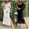 Rosegal Gothic Floral Lace Panel Balloon Sleeves Ruffles Ruched Solid A Line Midi Dress