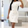 Slimming Knitted Dress Hollow Out Short Sleeve Lace Trim Waist Cinched Long Fashionable Sweater Dress